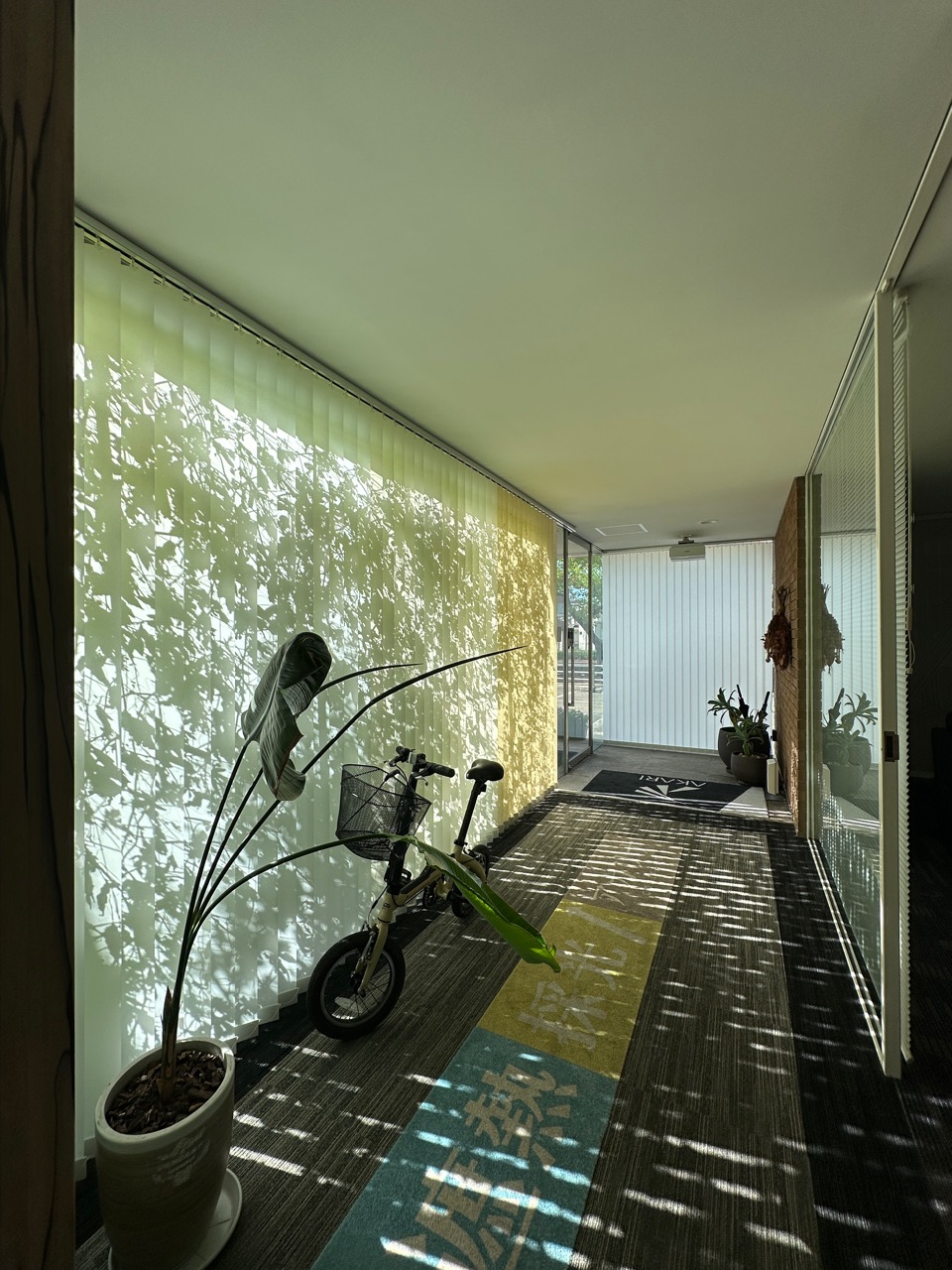昼はエントランスからオフィスへと続くナチュラルな環境で、夜はサイネージ。