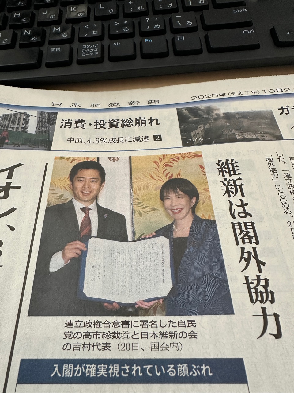 あまり政治に口を出したくありませんが、今朝の高市さんと吉村さんの笑顔の写真を見てホッコリしました。