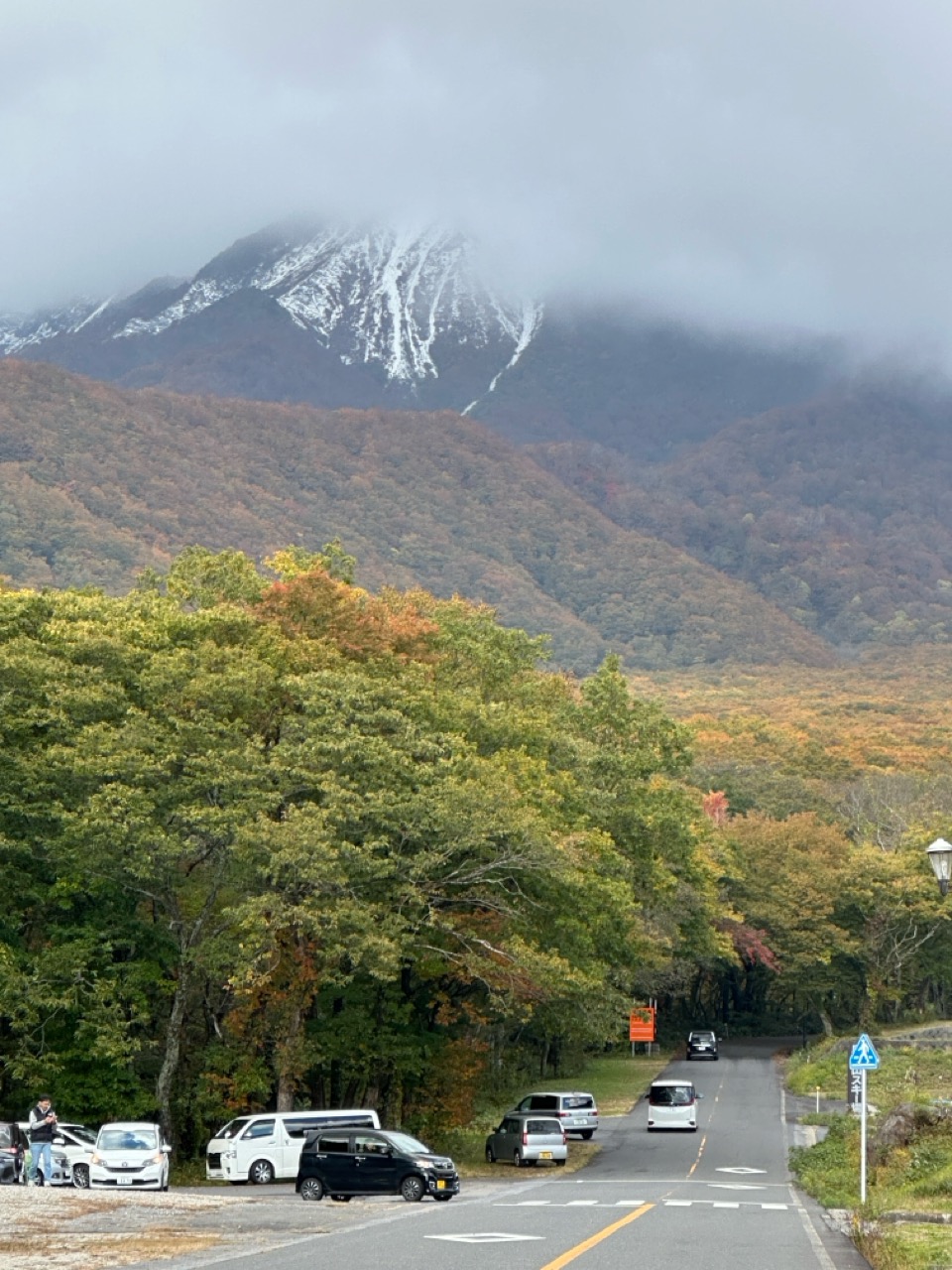 雪が積もる大山の下に広がる紅葉は、見応えがありました。