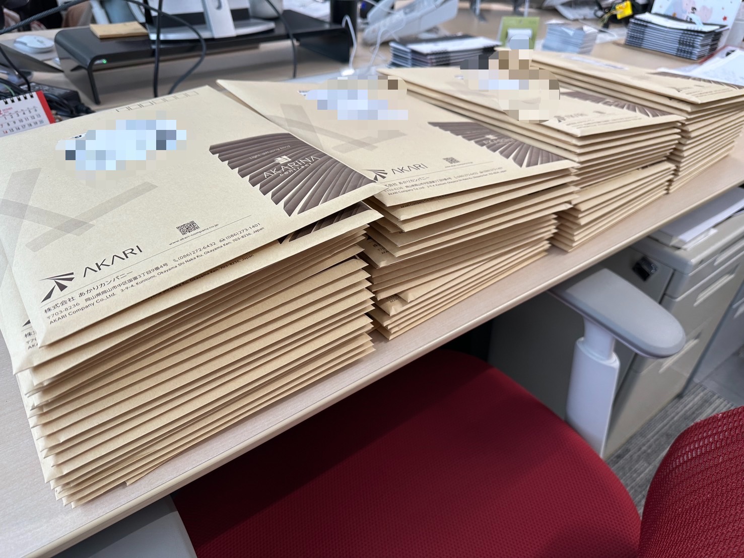 今日は、展示会でご依頼のあったカタログ送付の準備をしています。