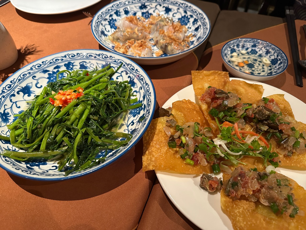 ホワイトローズ・空芯菜・揚げワンタン・・