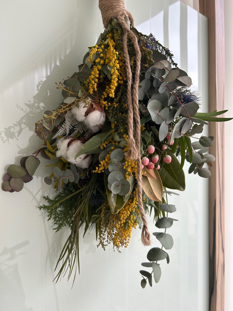 まだミモザの咲が甘いのですが、春になった特大のスワッグを送ってくださいます。