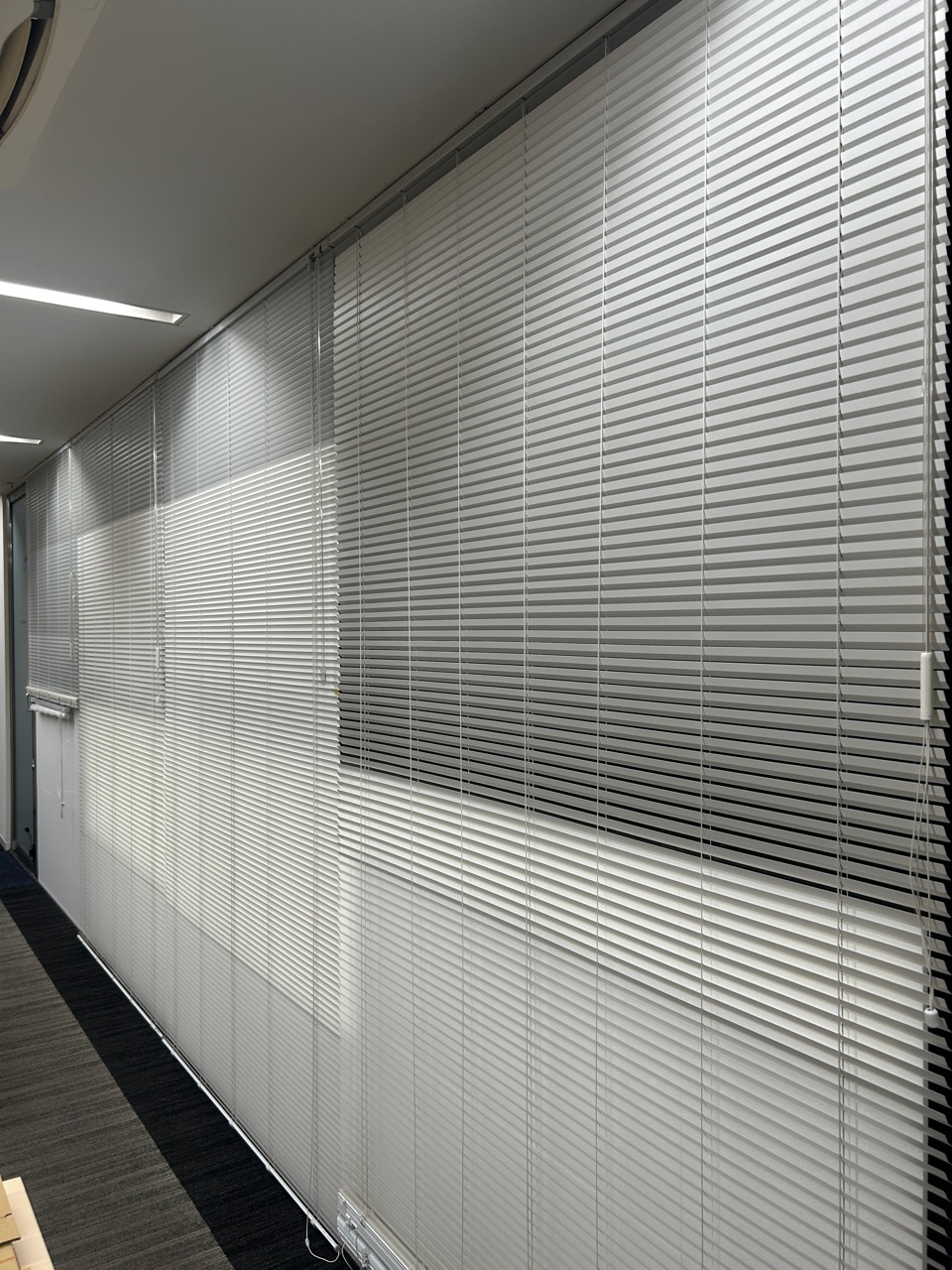 画像は弊社オフィスです。この一面が全面ガラスのため、必ず閉じた状態で退勤し、朝5時にエアコンを稼働させています。