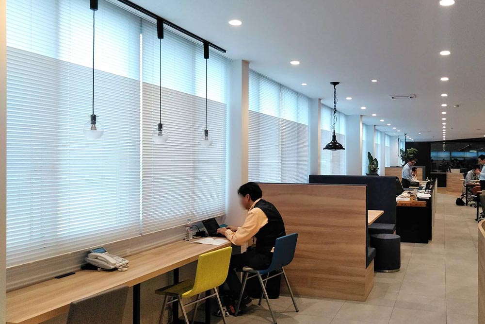 眩しい光を遮り、明るくやさしい光に変換・拡散して室内全体に広げます。スラット(はね)を閉じた状態でも明るいため、照明の利用を削減します。